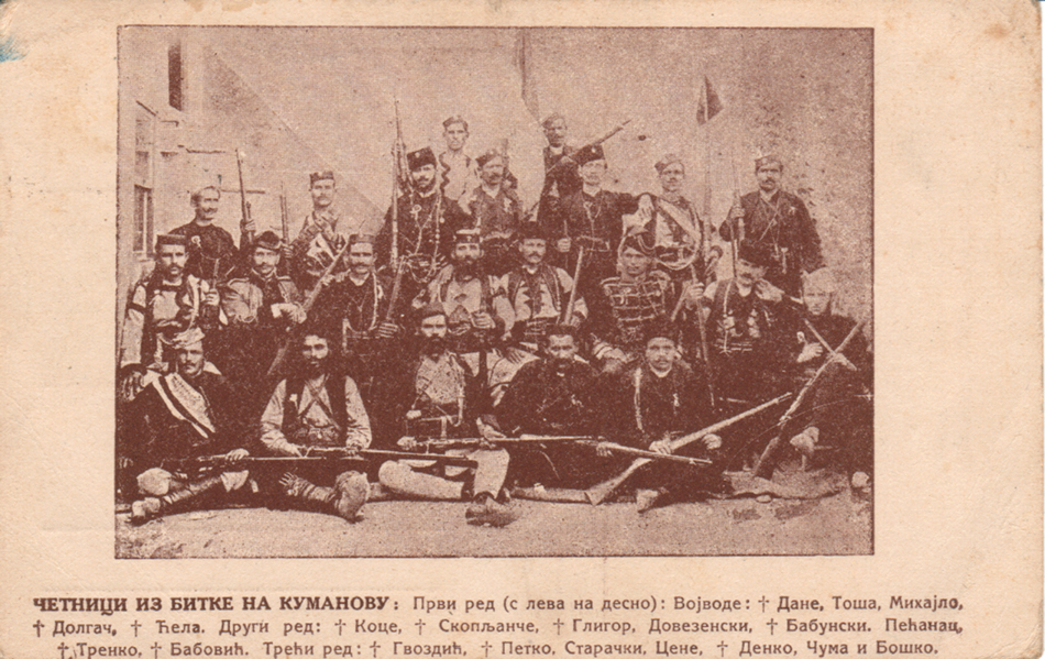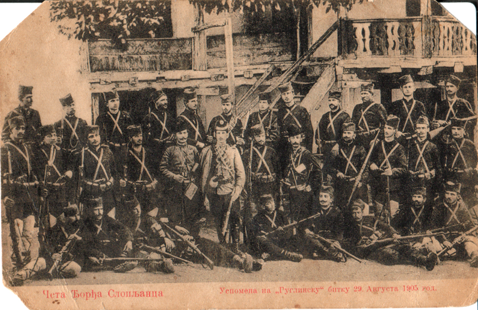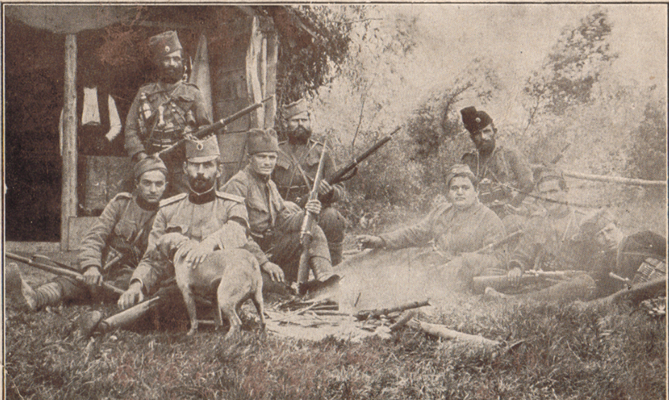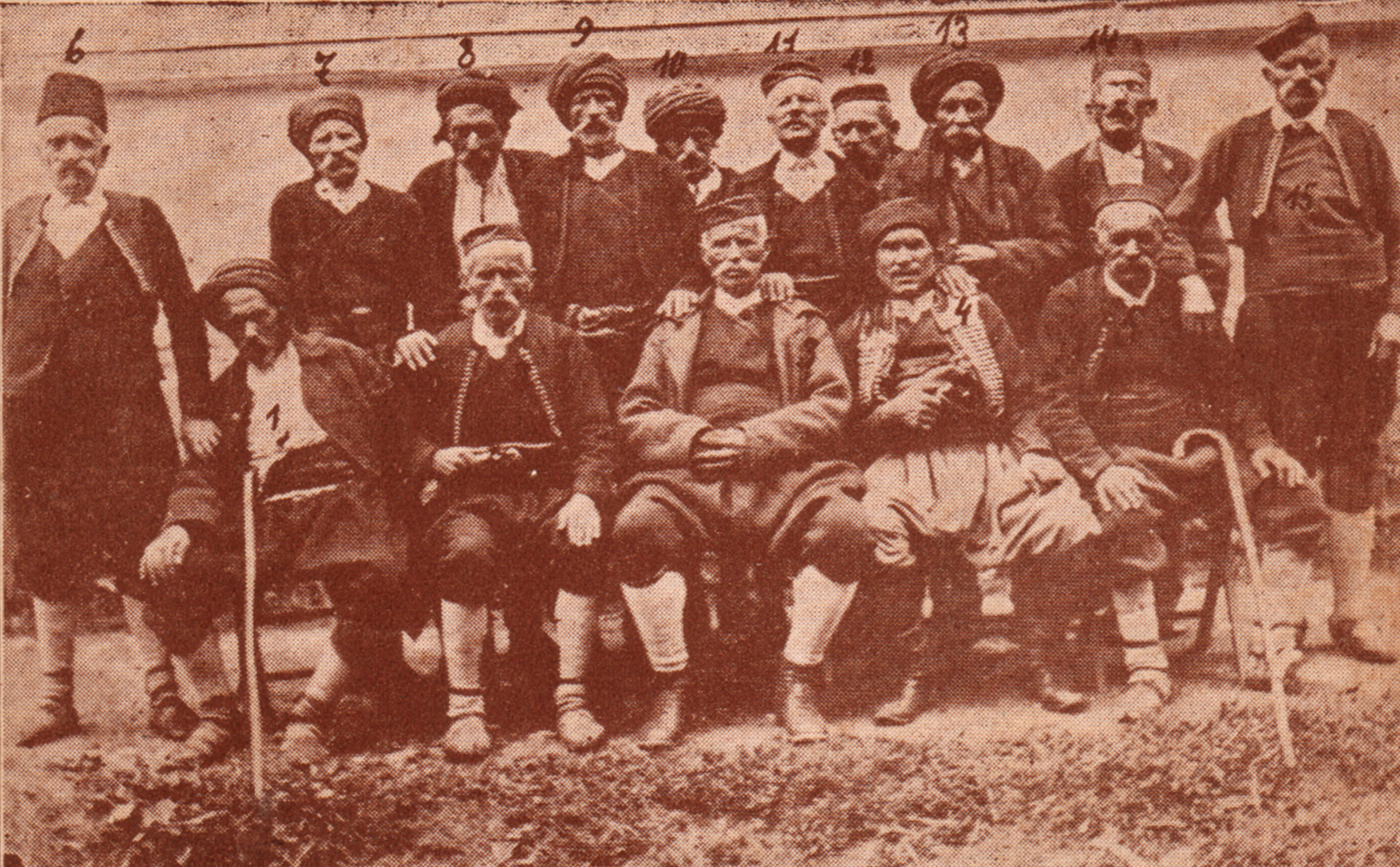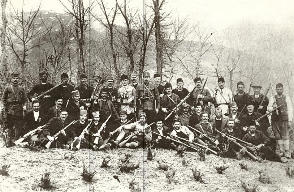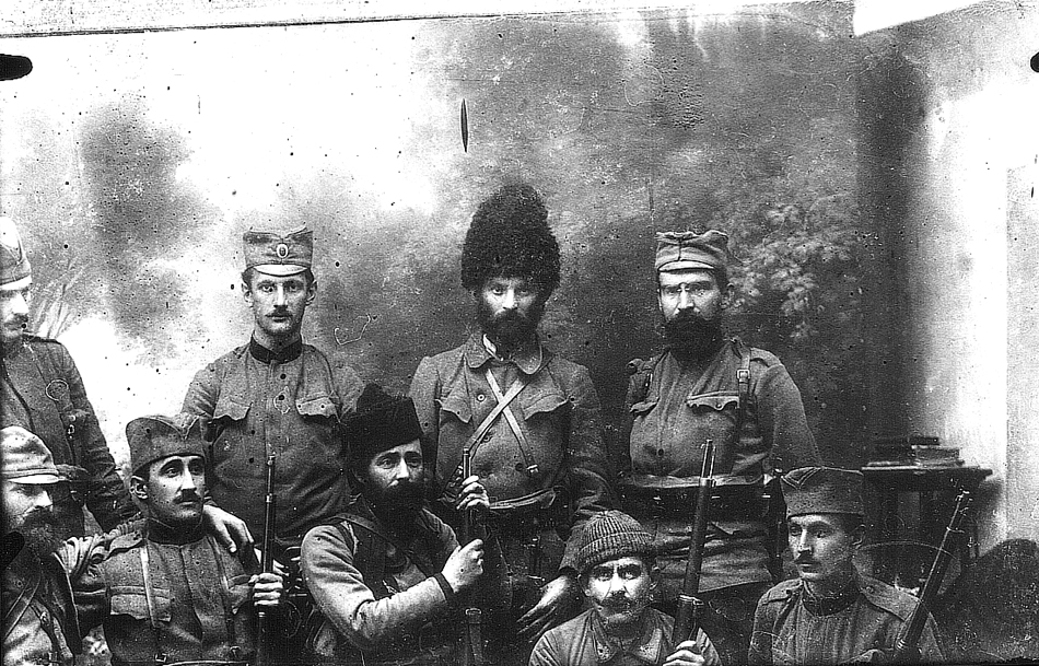 Војвода Воја Танкосић са својим четницима. Доњи ред с лева на десно: први НН, други Мустафа Голубић, трећи Танкосић, четврти Смајо Феровић (Омерагић) из Гусиња, пети НН. Горњи ред: НН, Владимир Милановић Воскар из Аранђеловца, Љуба Јовановић Чупа (оснивач часописа “Словенски југ” и “Пијемонт”, један од твораца “Црне руке”), НН.