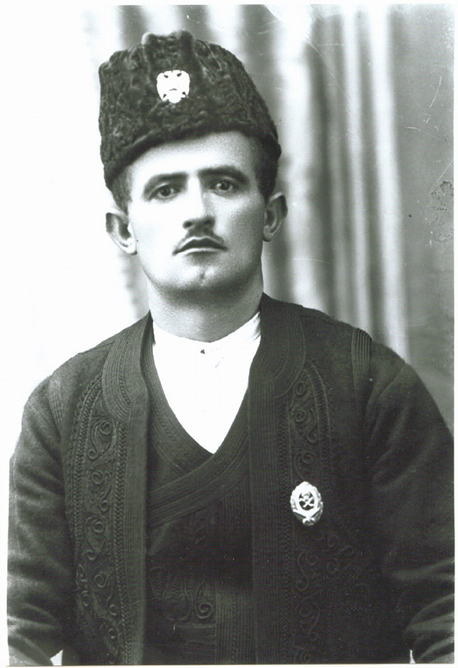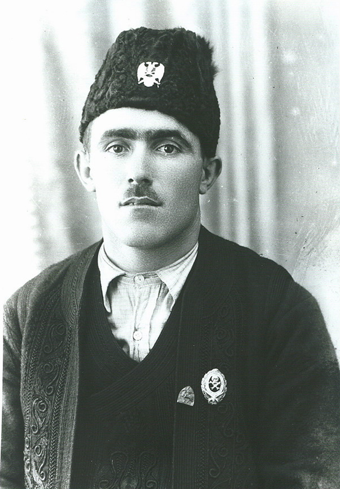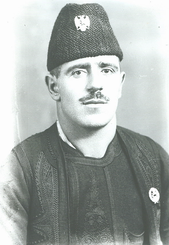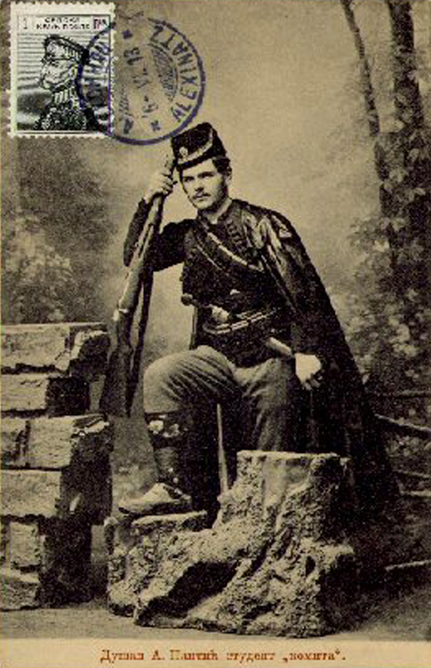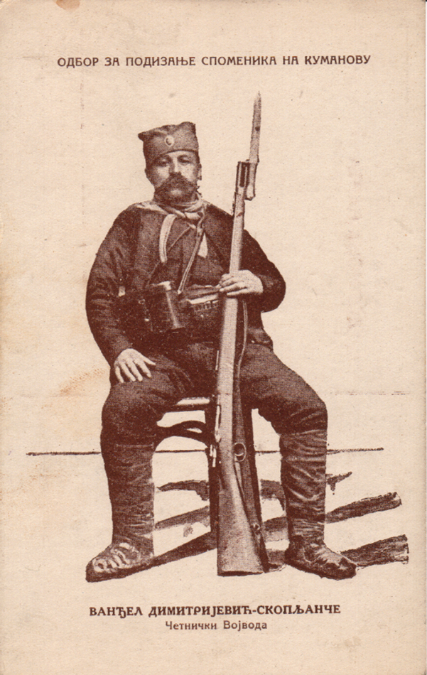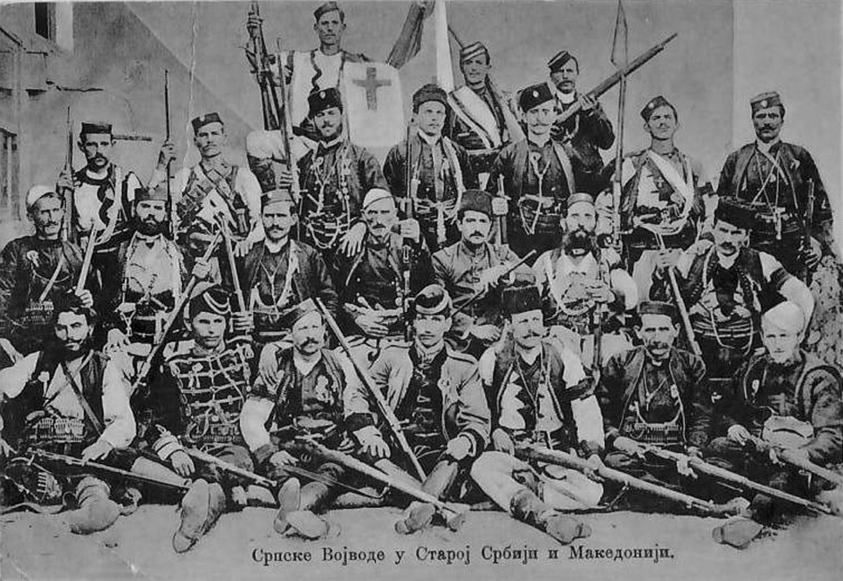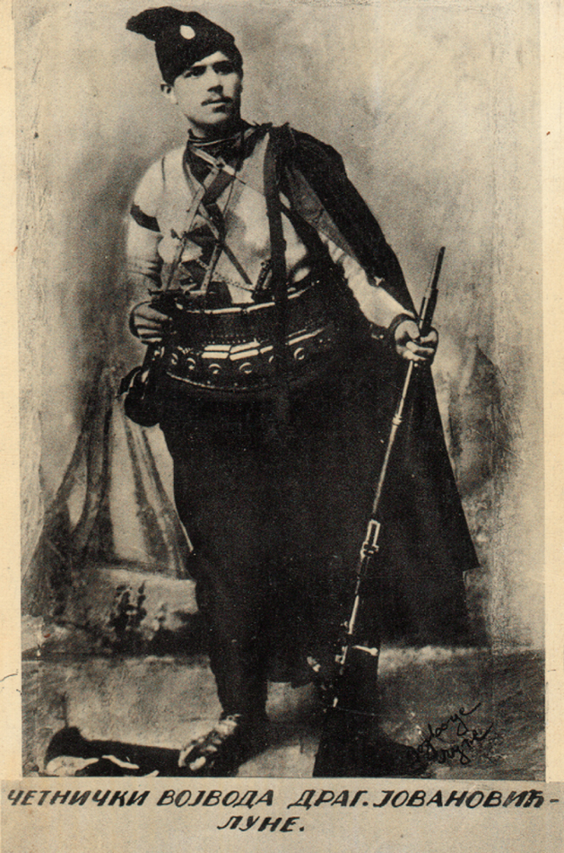 Војвода Воја Танкосић са својим четницима. Доњи ред с лева на десно: први НН, други Мустафа Голубић, трећи Танкосић, четврти Смајо Феровић (Омерагић) из Гусиња, пети НН. Горњи ред: НН, Владимир Милановић Воскар из Аранђеловца, Љуба Јовановић Чупа (оснивач часописа “Словенски југ” и “Пијемонт”, један од твораца “Црне руке”), НН.