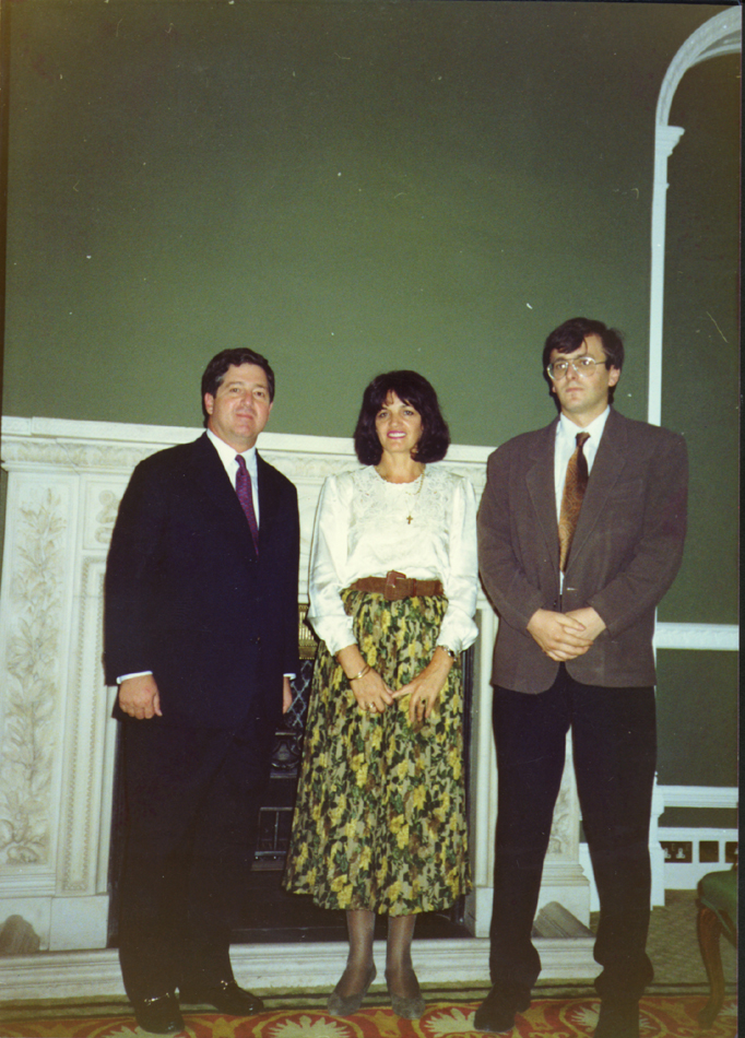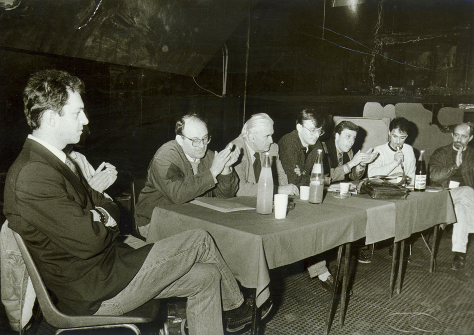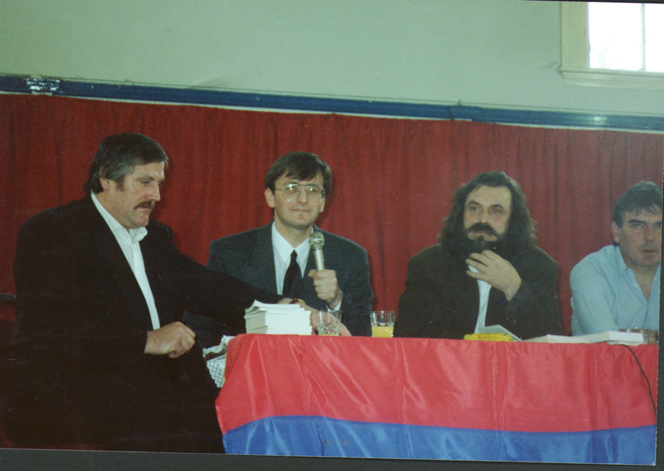 - Дом омладине у Београду, крајем 1990. или почетком 1991. Једна од многих промоција ”Погледа”, углавном пред пуним салама. Овде је била пуна. Са моје десне стране су наши тадашњи најеминентнији сарадници, академик Никола Милошевић и др Коста Чавошки. Први с лева заменик – Драган Ћирић