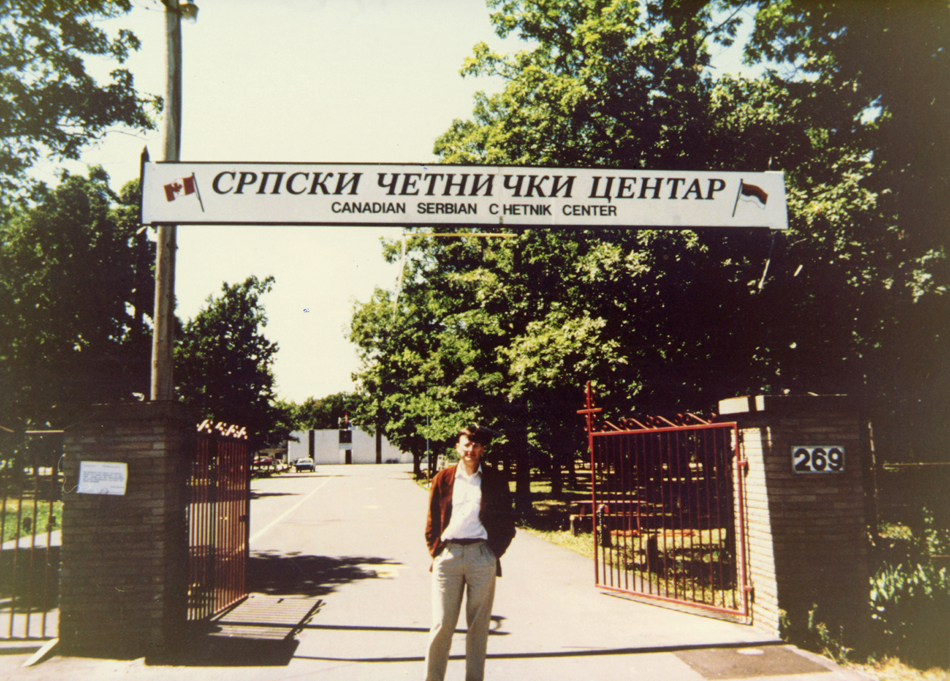 - Трибина у Торонту, августа 1991. Лево је Маринко Маријан, Јевђевићев четник, а десно Милан Стојановић, уредник радио часа на српском