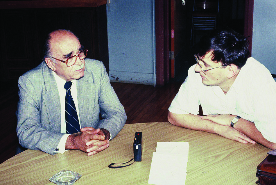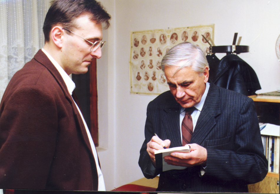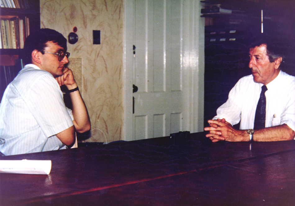 - У редакцији ”Погледа”, негде око 1998. Мијалко Перишић из Косјерића, четник Пожешког корпуса, и Милослав Самарџић