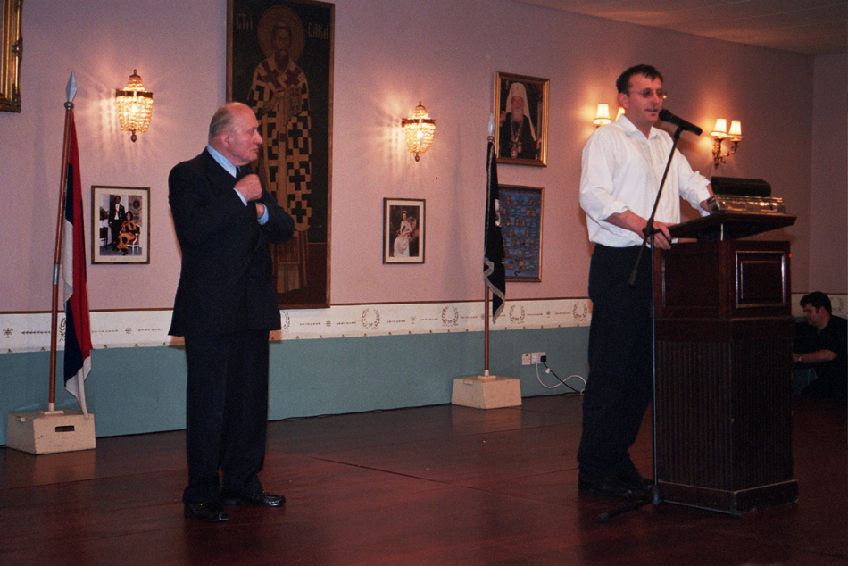 - Истог дана, у Дому епископа Николаја, који се налази поред цркве. Десно је председник ПСЧ за Велику Британију, Милан Стојсављевић. Током рата официр Динарске дивизије. На жалост, преминуо је 2012. године. Био је изузетна личност. Бојим се да нема таквих у нашој генерацији! Ове године био сам главни говорник за Дражин дан