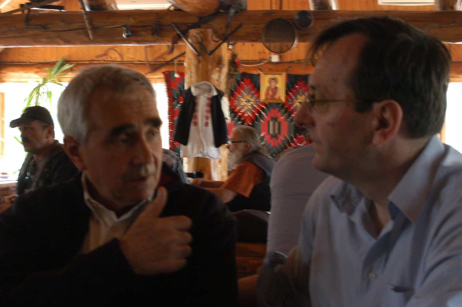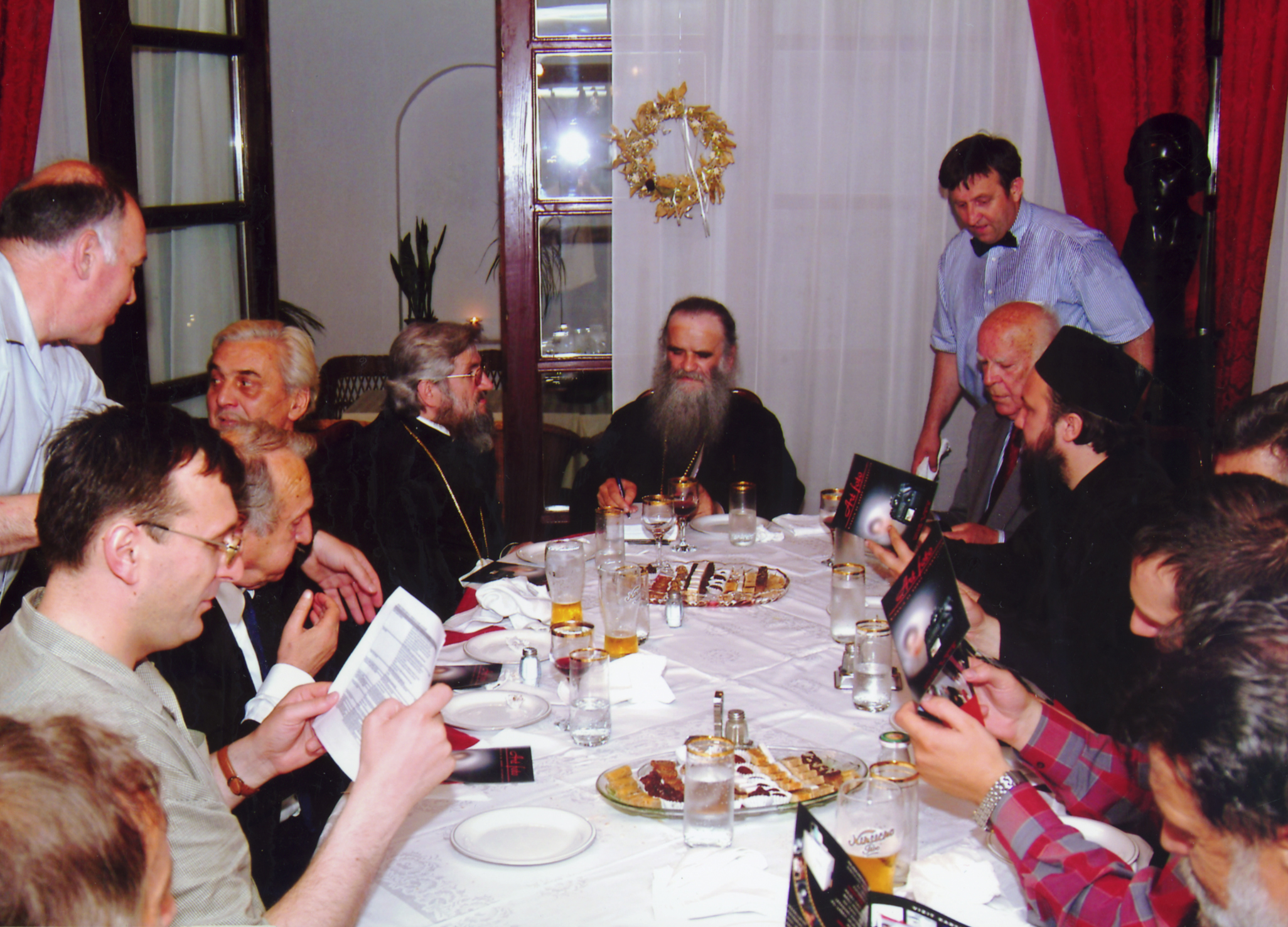 - Аранђеловац, ресторан ”Александар”, 2004. Вечера после трибине о злочинима комуниста, одржане у препуном биоскопу. За совром је митрополит Амфилохије, лево је владика Јован, десно јереј Џомић. До владике седи прерано преминули глумац Данило Лазовић