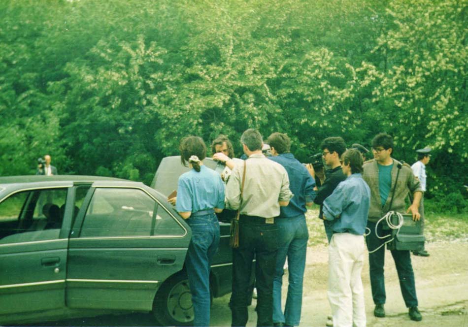 - Истом приликом, претресају нам кола. Даница је прва с лева, ја сам трећи (фармерке). Ови што снимају су са Телевизије Београд и то је увече било у ТВ Дневнику, у 19,30, са неким ужасним коментаром, а онда је ишла репортажа из села Вранић…