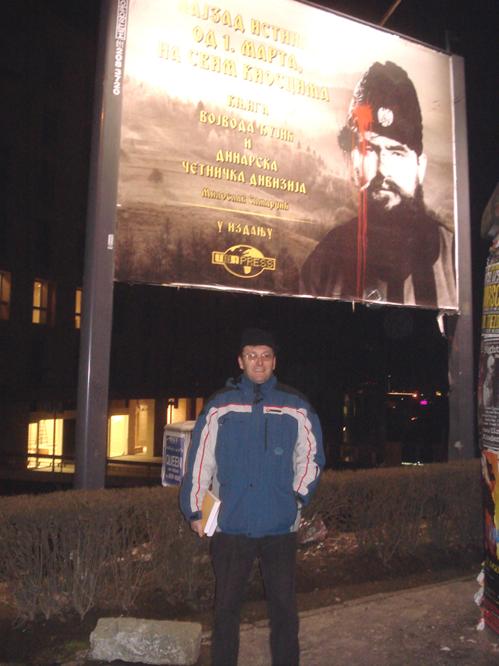 - Испред билборда у Београду, поред Хотела ”Москва”, 2009. Постављена је серија билборда поводом изласка из штампе књиге ”Војвода Ђујић и Динарска четничка дивизија”, а тзв. антифашисти све су их гађали црвеном бојом…