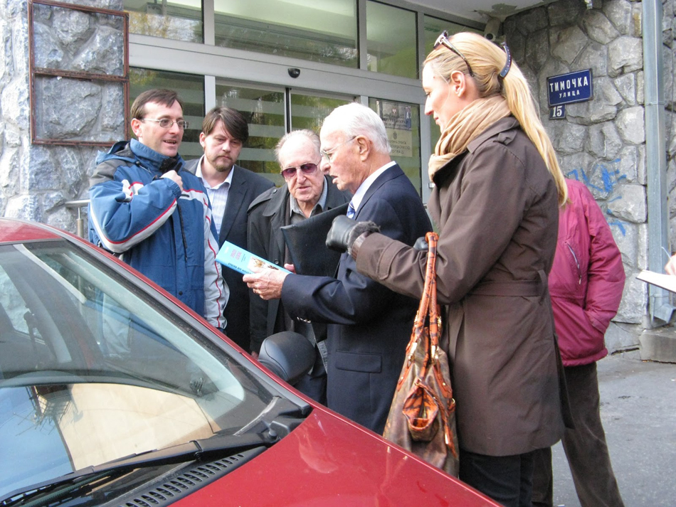 - Београд, 29. октобра 2010, испред Вишег суда. Овог дана одржано је једно од рочишта у процесу рехабилитације ђенерала Драже (ја сам један од подносилаца захтева). На слици је спашени амерички пилот Милтон Френд, који се пријавио као сведок и дошао из Америке о свом трошку. Ширли Френд, Милтонова супруга, је овековечила тренутак када сам њеном мужу поклонио књигу о спашавању пилота на енглеском језику