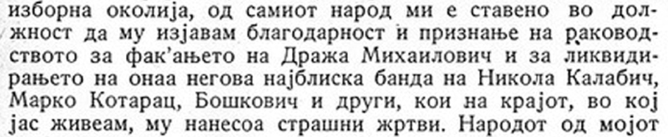 10 Свидетелства на народот за предателство и злочините на Дража Михаилович, 7-9. Реч је о брошури објављеној у Скопљу 1946. године, која садржи говор Александра Ранковића од 24. марта 1946, говоре двојице министара од 12. априла 1946, као и низ ”телеграма подршке”. Брошура није објављена у Београду, па се изводи из Ранковићевог говора цитирају из штампе, често непрецизно и без битних делова. У Србији такође нису познати поменути говори двојице министара. Делове једног од тих говора доносимо у наставку, док други говор садржи само фразе, па неће бити цитиран. Превод са македонског: М. Самарџић. Овај примерак брошуре сачуван је у Народној библиотеци у Софији.