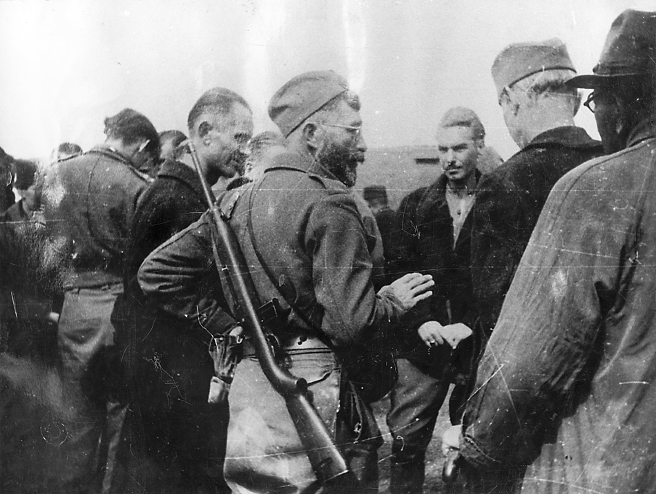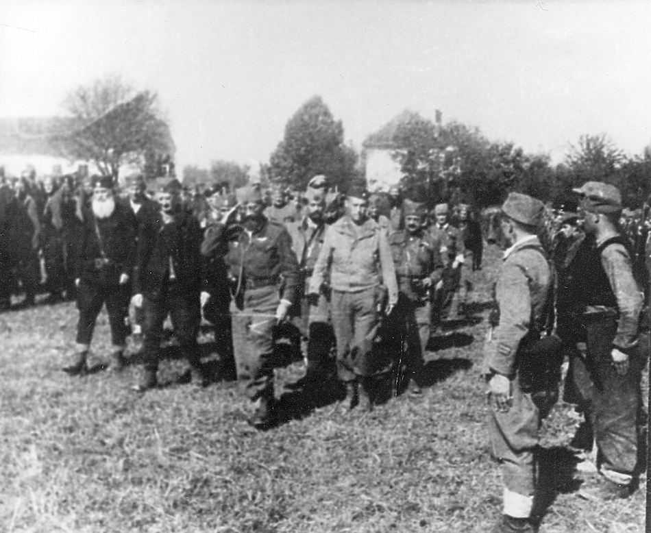 Le général Mihailovic avec le sreprésentants de la mission militaire américaine (de gauche à droite) : le colonel Robert McDowell (mission Ranger), le capitaine Georges Musulin et le capitaine Nick Lalic (mission Halyard)