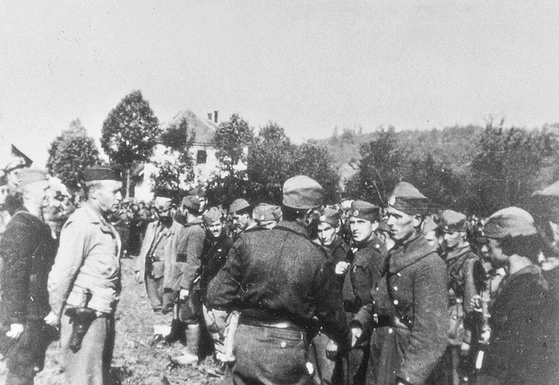 Le général Draza Mihailovic passant en revue les Cetniks de Bosnie occidentale en octobre 1944 à Trebava. Au bout du rang le colonel Slavoljub Vranjevsevic commandant les Cetniks de Bosnie occidentale. Derrière le général Draza le colonel américain Robert McDowell et derrière celui-ci le Dr Stevan Moljevic, membre du Comité National Central.