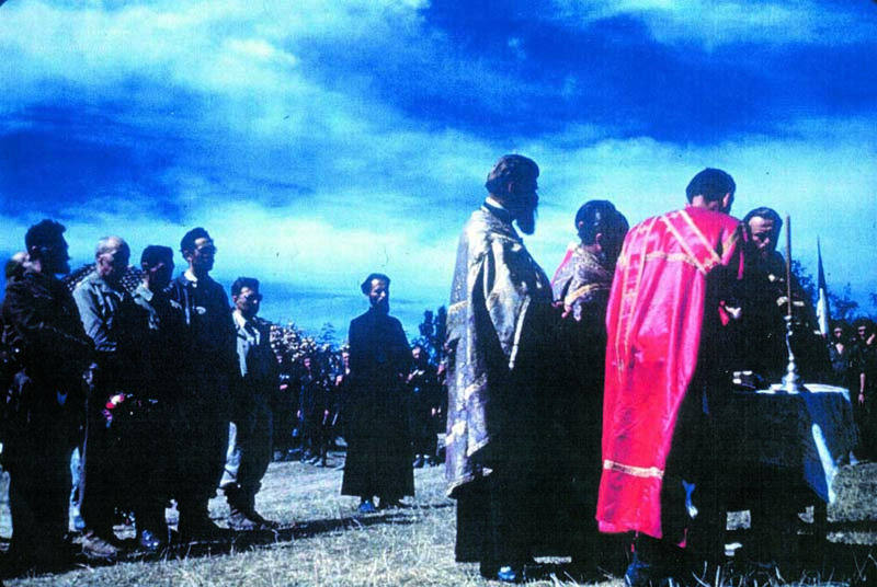 Le général Draza Mihailovic au milieu du peuple dans la Pranjani en septembre 1944 après une messe. A l’extrême droite, le capitaine américain Mike Rajacic.