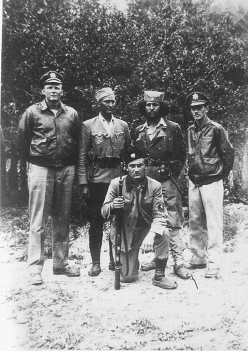 Dans la région de la Matchva ou de la Semberija, automne 1944. Le général Draza Mihailovic avec une mission militaire américaine. Aux cotés de Draza, le colonel McDowell et le dernier sur la droite le capitaine américain Nik Lalic.