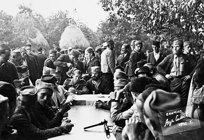 Un détail de la prestation de serment du 2ème corps d’armée de Ravna Gora dans le village de Vujetinci. Majnard et Rakovic sont assis à la grande table.