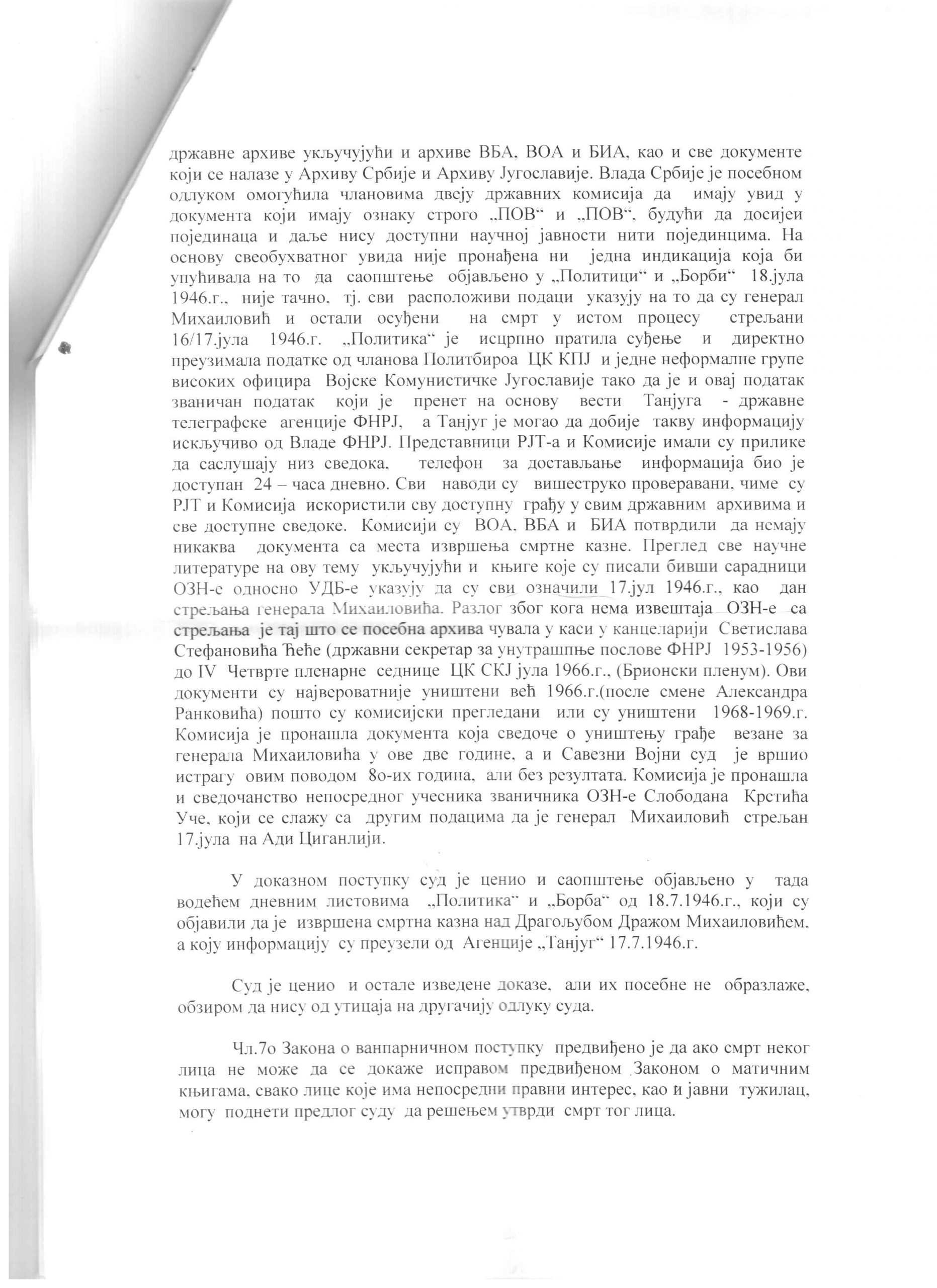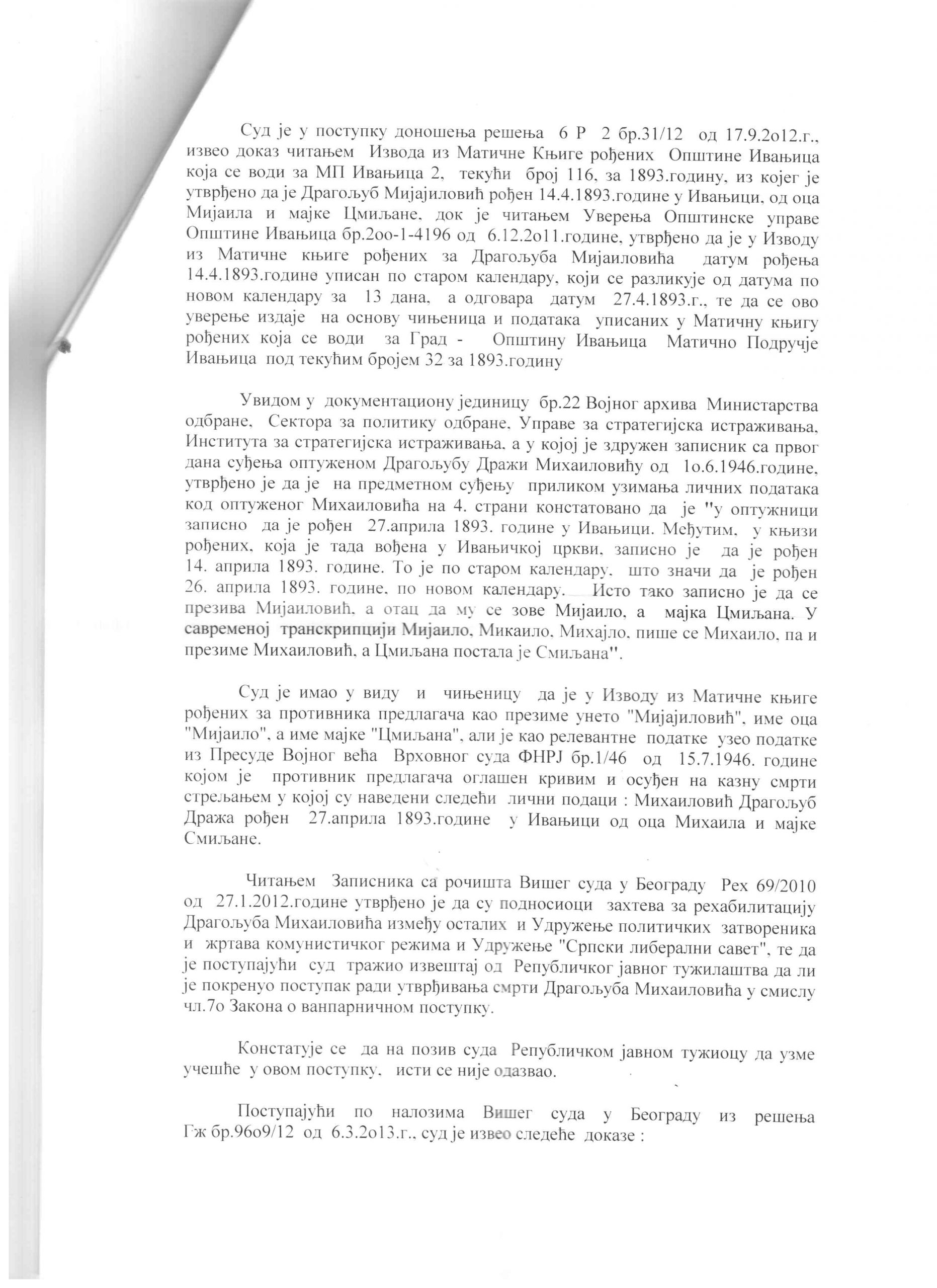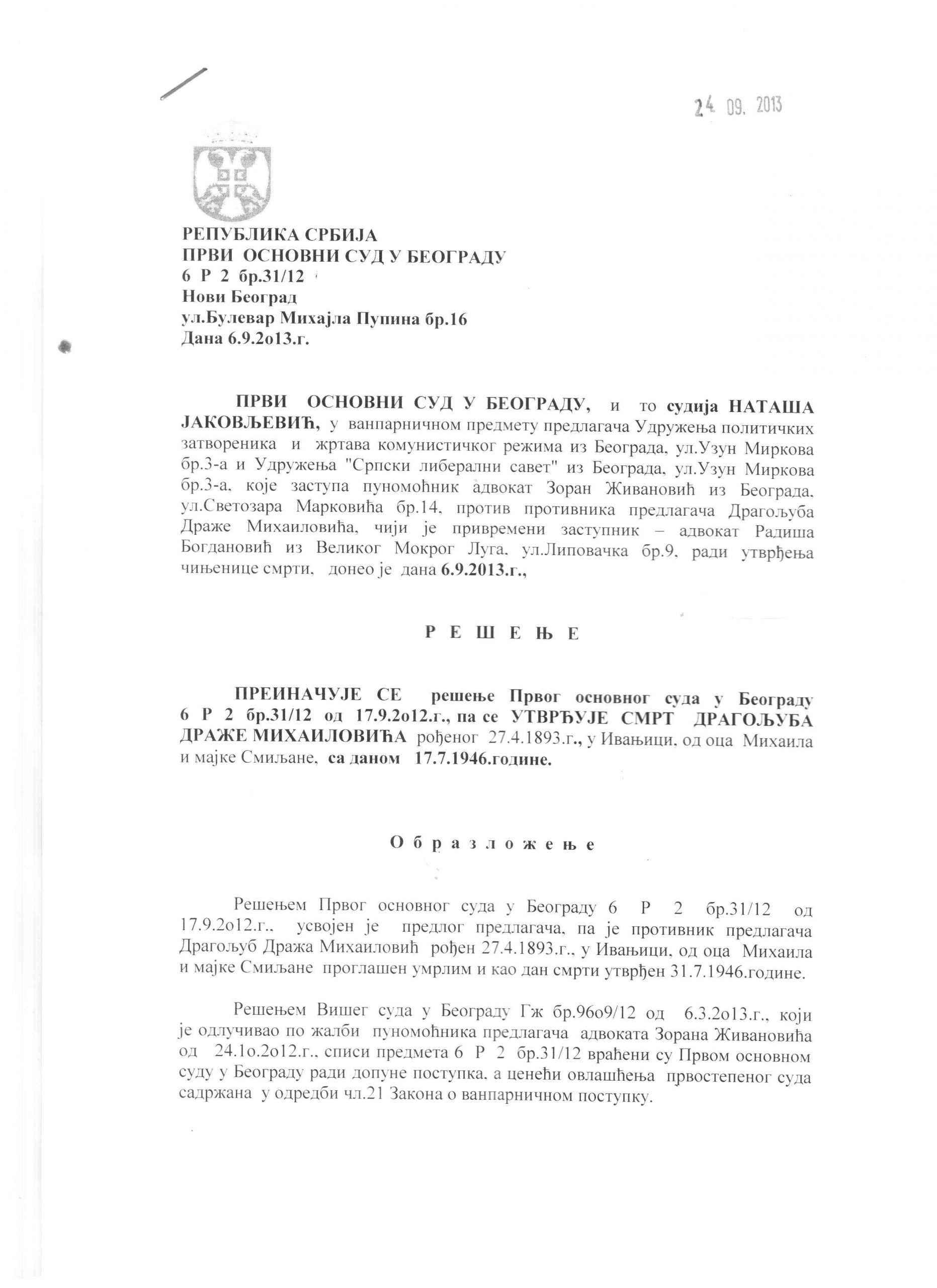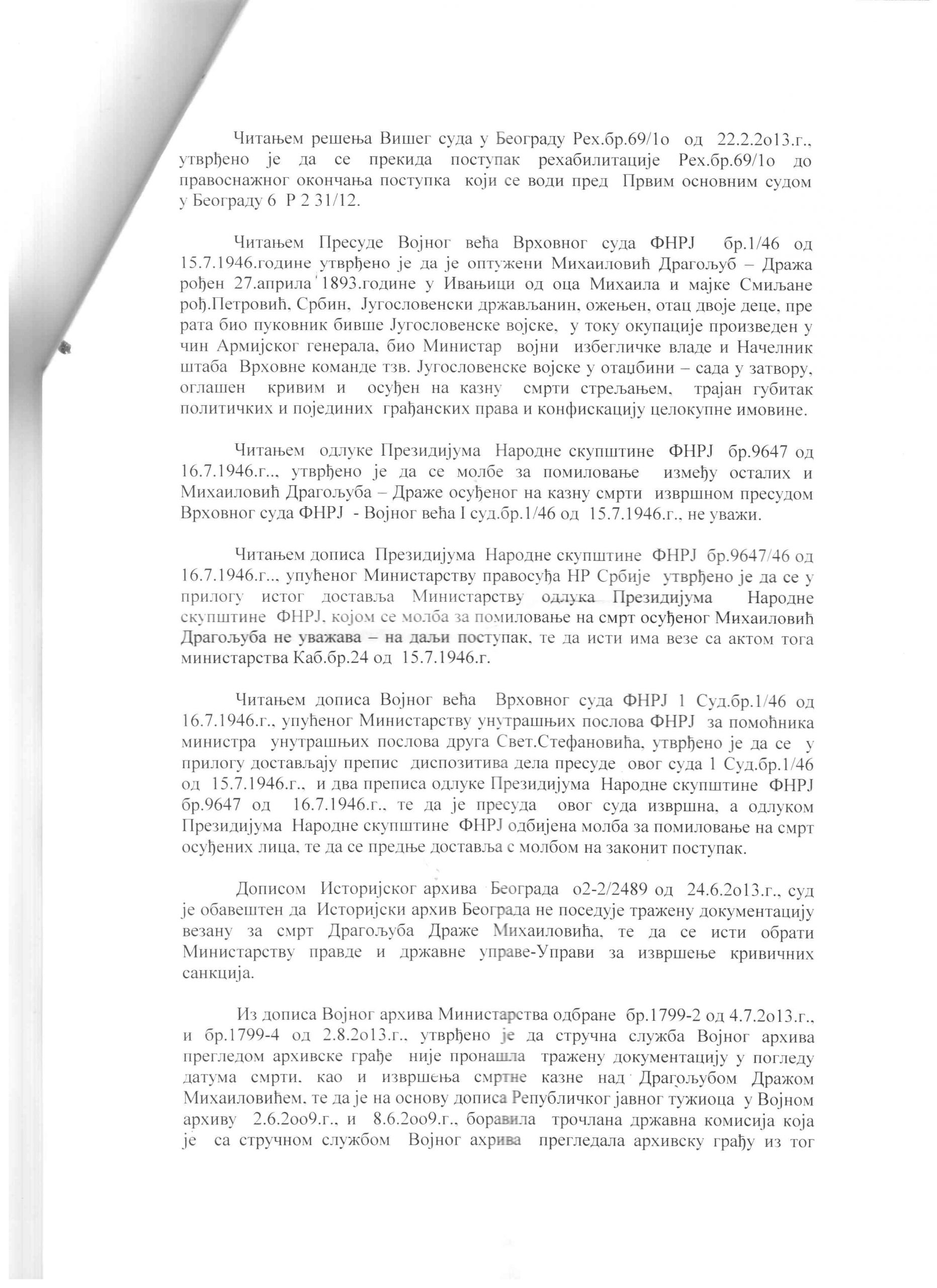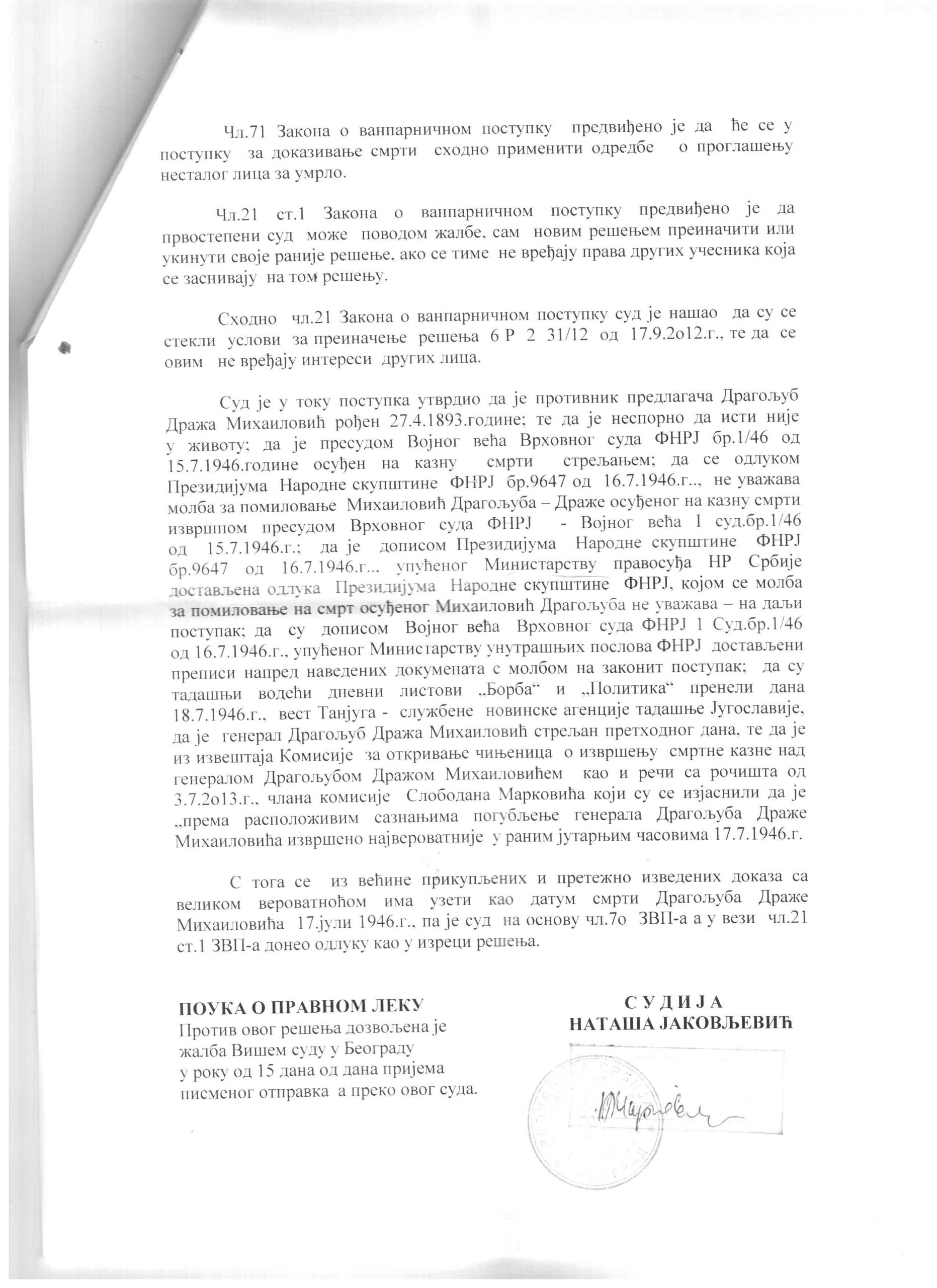HomeИсторијаДража МихаиловићПроцес рехабилитацијеРешење о утврђивању датума Дражине смрти