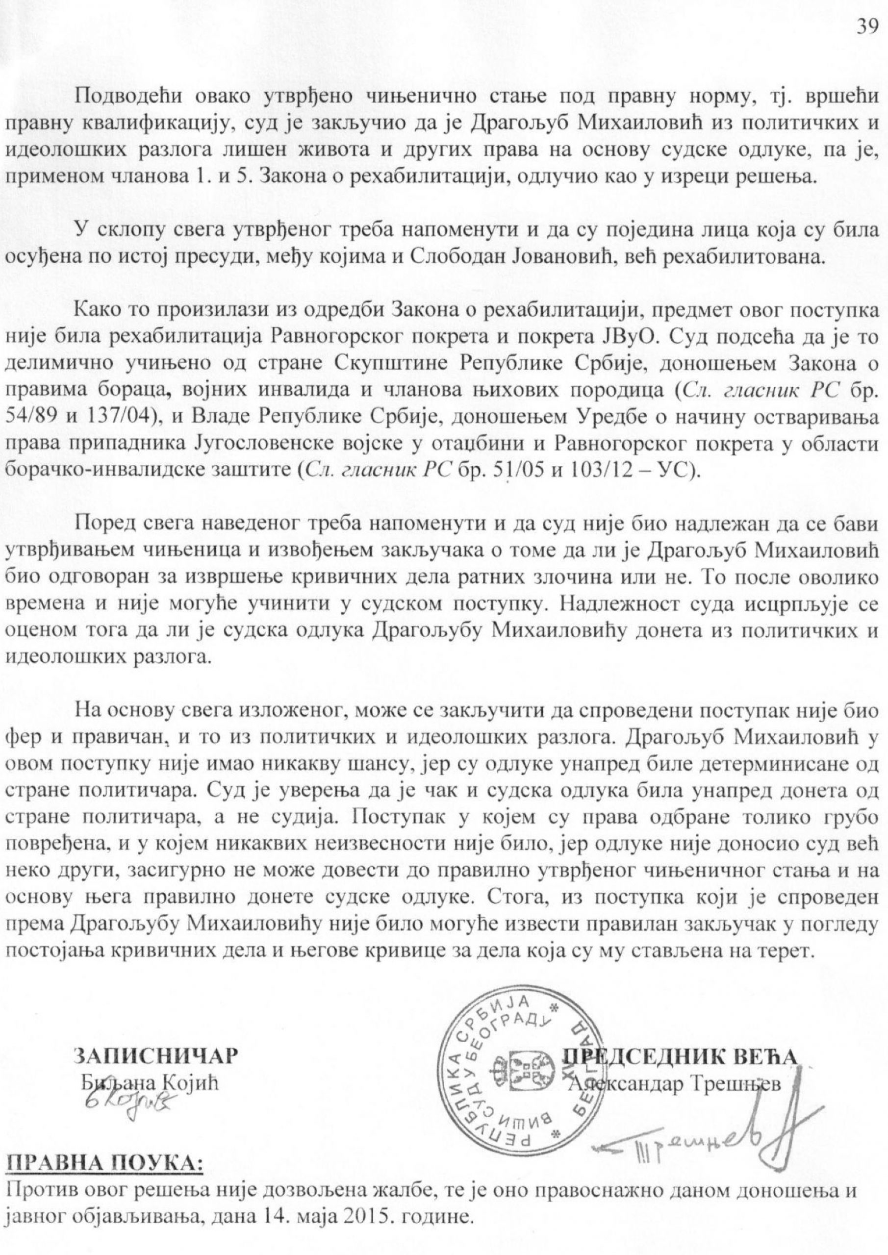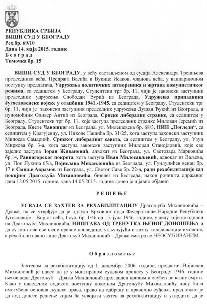 HomeИсторијаДража МихаиловићПроцес рехабилитацијеРешење о Дражиној рехабилитацији