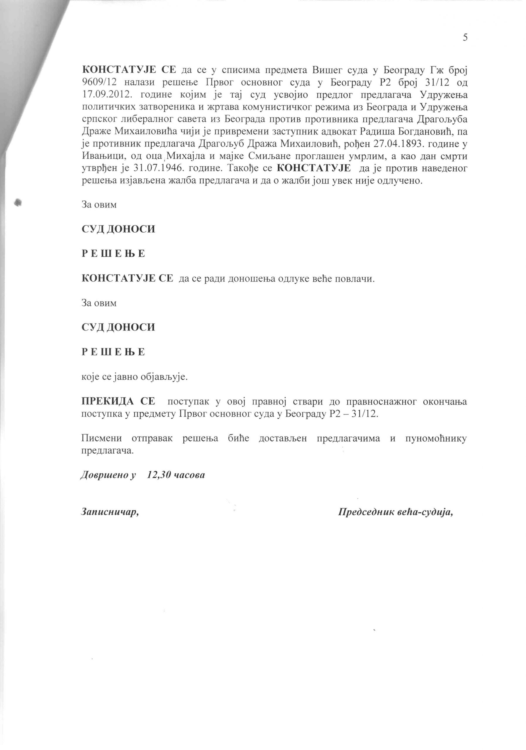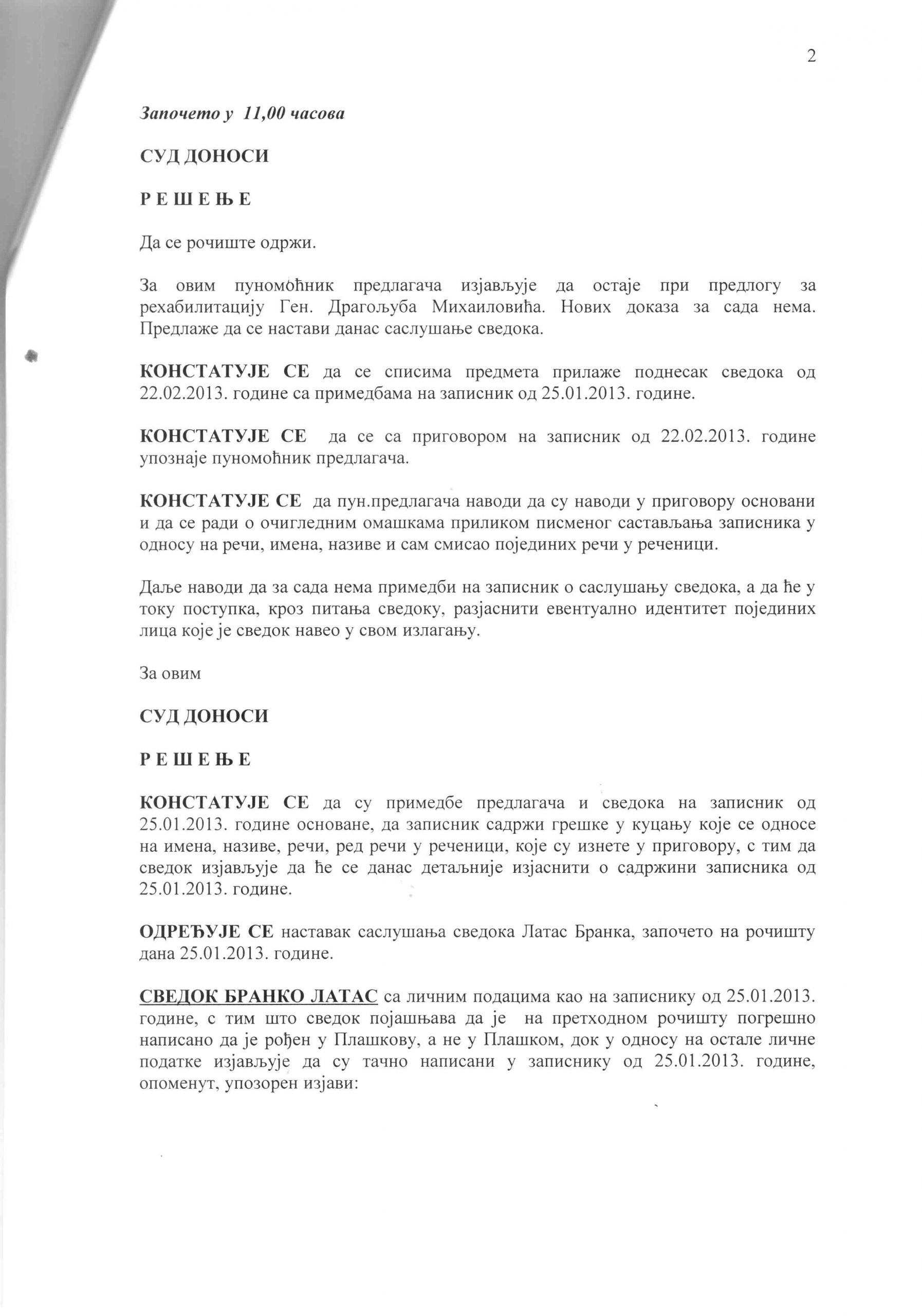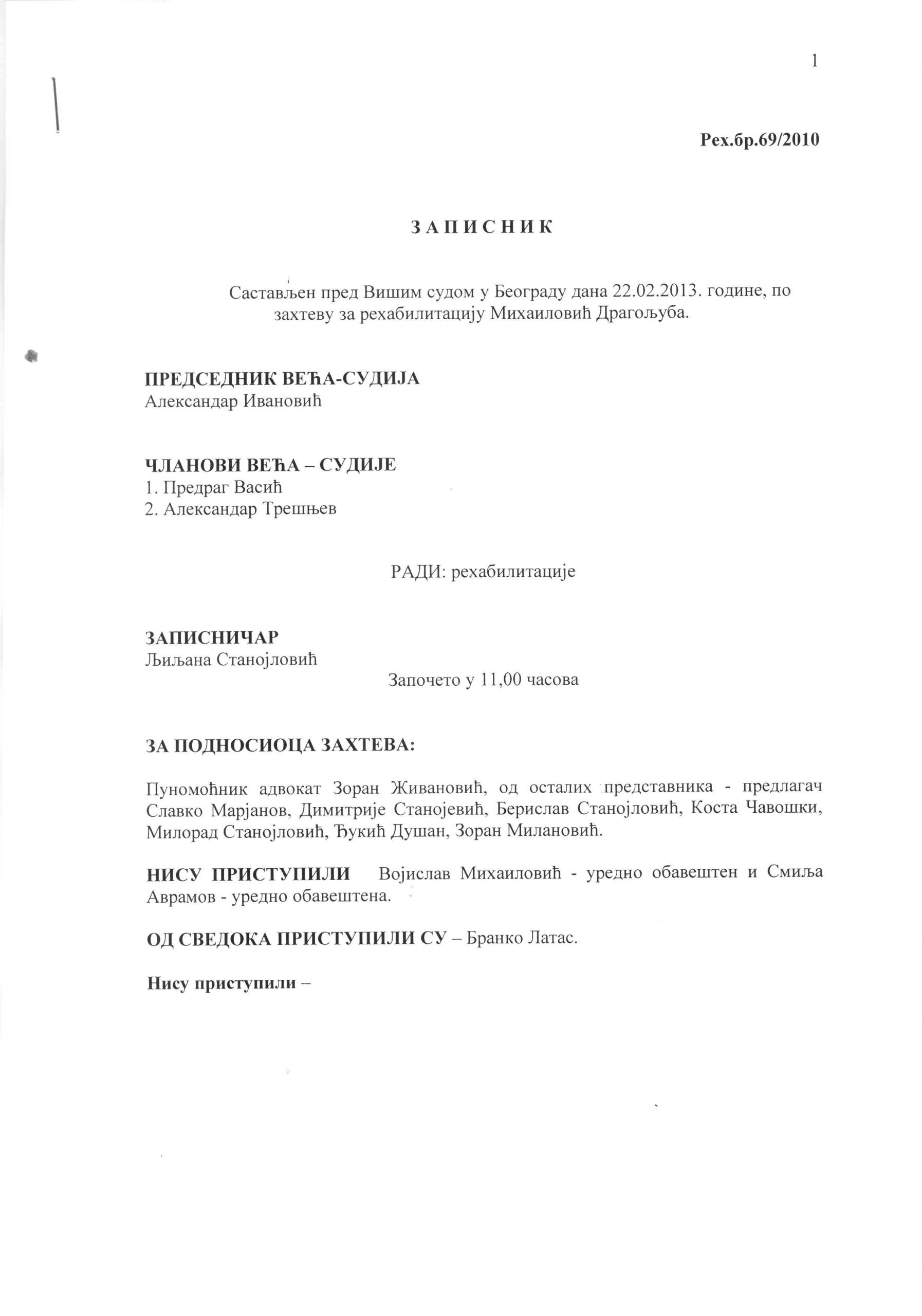 HomeИсторијаДража МихаиловићПроцес рехабилитацијеЗаписник са рочишта од 22. фебруара 2013.